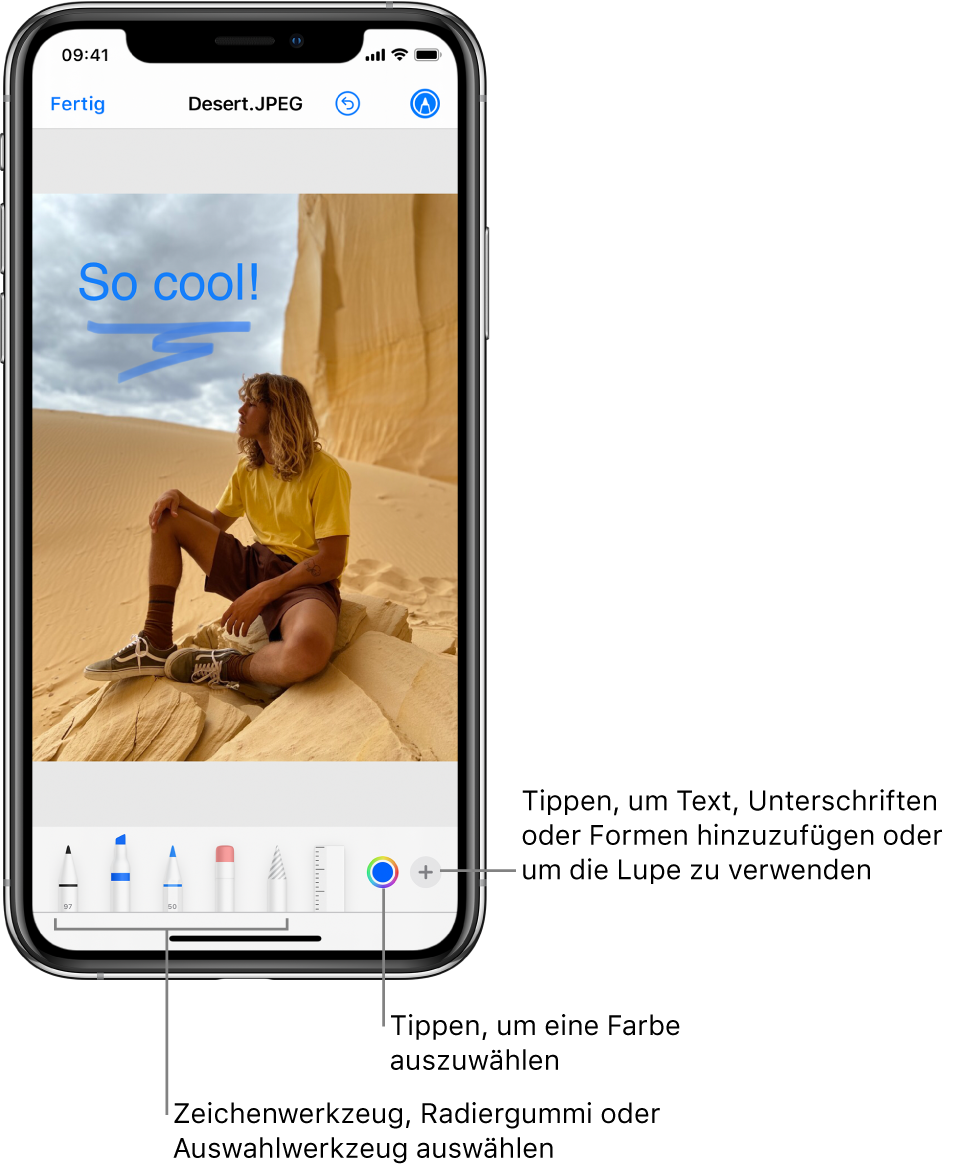 Du kannst die Dateien sortieren oder die Einstellungen ausprobieren. Öffnen Sie das Foto das Sie umwandeln möchten in der Fotos App. Verwende die Zeichenwerkzeuge um mit deinem Finger zu zeichnen.